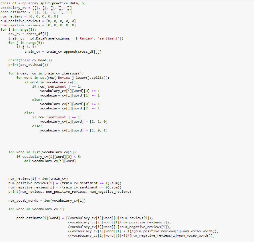 Building vocabulary to find probabilities of the words and implenting laplace smoothing : referenced links helped me to implement it without library.